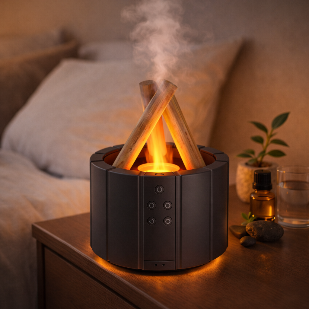 El Humidificador Aromatizante con efecto llama simulada combina humidificación ultrasónica, iluminación LED cálida y diseño decorativo tipo fogata para crear una experiencia visual y sensorial única.